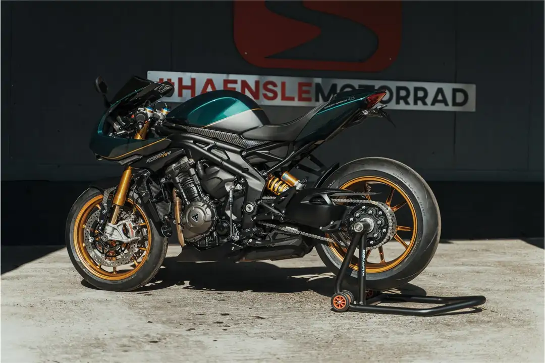 Erleben Sie die ultimative Speed Triple 1200 RR. Mit der edlen Lackierung in grün und akzentuierten gold-matten Details ist das Bike ein echter Hingucker auf der Straße. Der kurze Kennzeichenhalter sorgt für ein kompaktes Heck, das schwarze Windschild und schwarz beschichtete Anbauteile vollenden den Look. Der SC-Project Endschalldämpfer bringt kraftvollen Sound in dieses Ensemble. Green Goblin wird Sie begeistern!